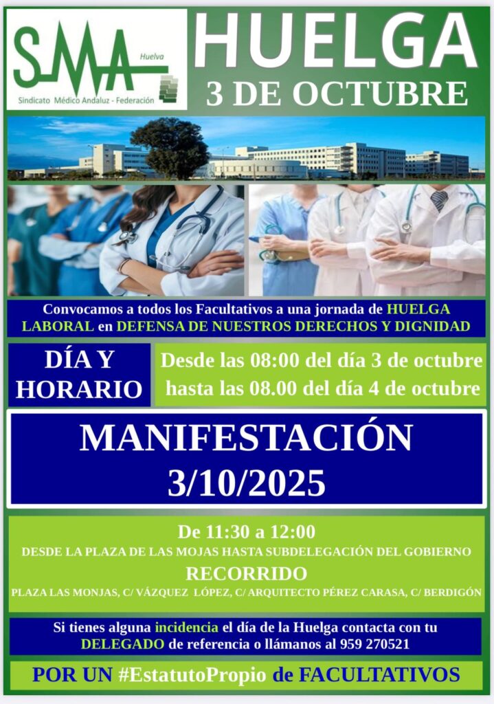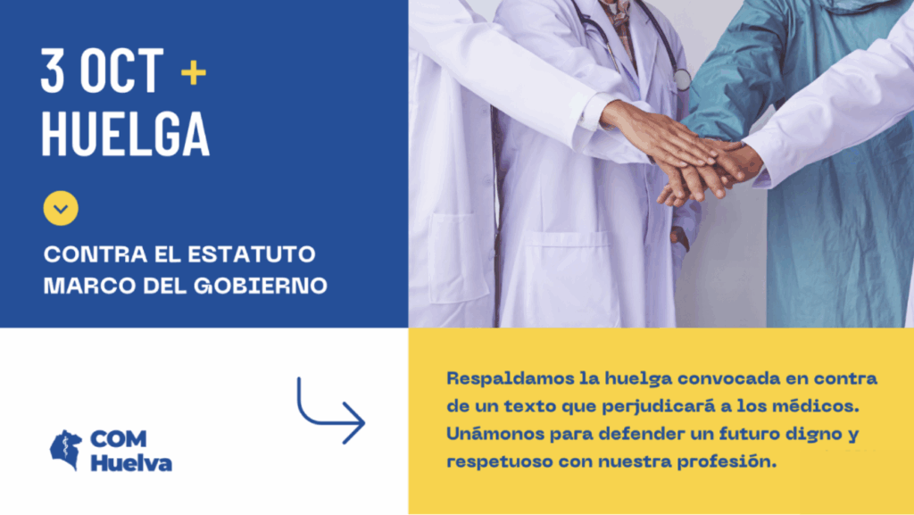 El colegio médico de Huelva muestra su respaldo a la huelga del próximo 3 de octubre cnvocada por la Confederación Española de Sindicatos Médicos (CESM) y el Sindicato Médico Andaluz (SMA), contra el anteproyecto del Estatuto Marco planteado por el Gobierno, por considerar que perjudica drásticamente el futuro de la profesión médica y su ejercicio, y por ende, al conjunto de la ciudadanía.