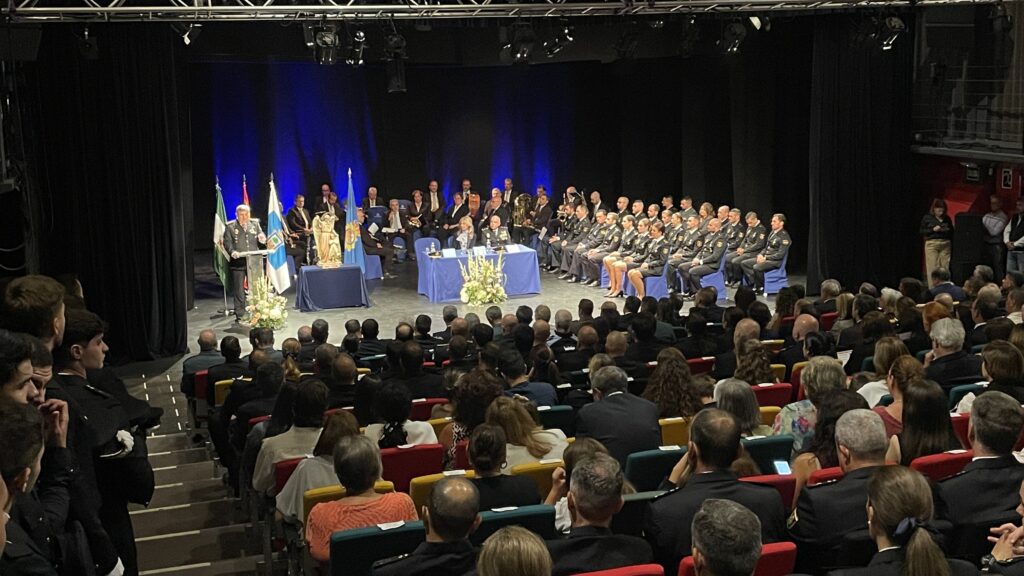 La presidenta del Colegio de Médicos de Huelva, Mercedes Ramblado, y el responsable jurídico de la institución profesional, José María Mora, han asistido a esta conmemoración del Día de la Policía, un evento en el que el cuerpo policial ha estado arropado por numerosos representantes de la sociedad onubense.