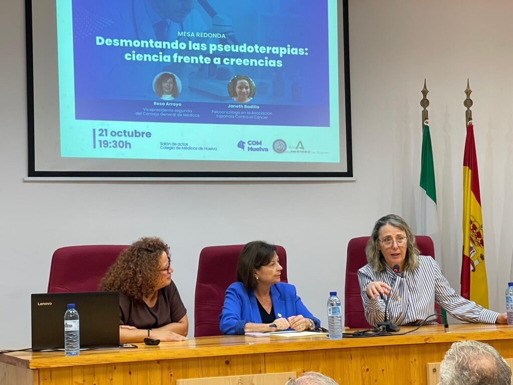 La médico y la psicooncóloga han protagonizado la mesa redonda “Desmontando las Pseudoterapias: ciencia frente a creencias” celebrado en el Colegio de Médicos de Huelva junto a la Academia de las Artes, Ciencias y Letras de Huelva, con sus presidentes, Mercedes Ramblado y Emilio Pascual. Ambas ponentes han coincidido en que el daño viene por retrasos o abandonos en el tratamiento, generando falsas expectativas en los pacientes, con el consiguiente perjuicio psicológico, además de poder constituir delitos de estafa.