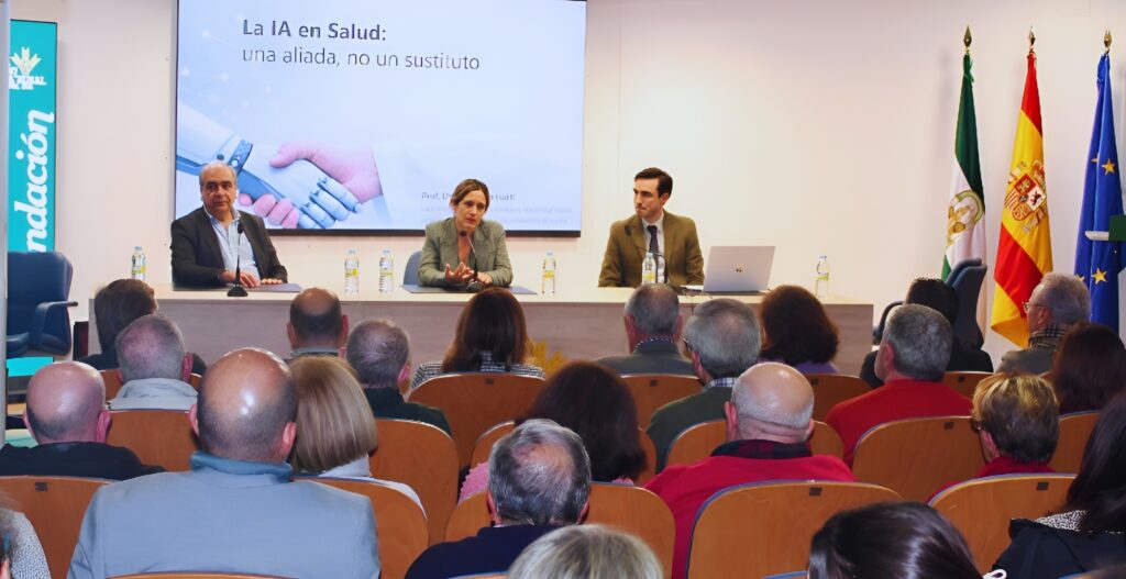 El salón de la Fundación Caja Rural del Sur registró un lleno pese a la lluvia y donde el público participó en el debate durante un amplísimo turno de preguntas. El coloquio sobre la ‘Aplicación de la IA en Salud’ estuvo moderado por la cardióloga y tesorera del Colegio de Médicos, Ana Manóvel.