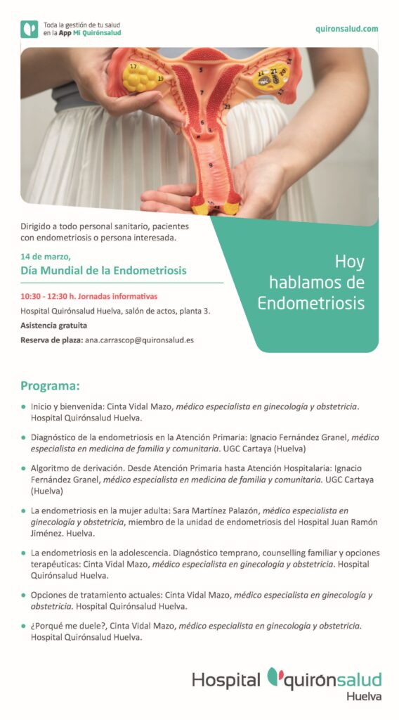 Las Jornadas informativas sobre endometriosis, que se celebrarán en el Hospital Quirónsalud Huelva, tendrán lugar el próximo sábado 14 de marzo, con motivo de la celebración del Día Mundial de la Endometriosis.