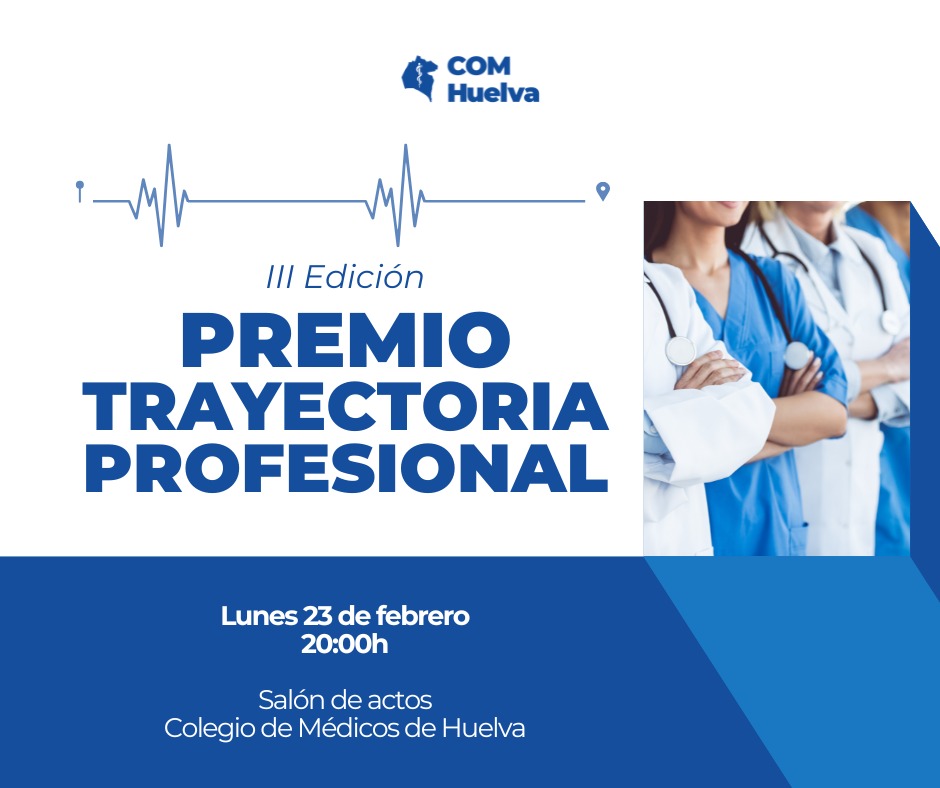 El próximo 23 de febrero, a las 20h, en el Salón de Actos del Colegio de Médicos de Huelva (C/ Arcipreste González García 11), se llevará a efecto la Ceremonia de Entrega de los III Premios a la Trayectoria Profesional que otorga el Colegio Oficial de Médicos de Huelva para reconocer la excelencia, el compromiso y la dedicación de los médicos de nuestra Provincia a lo largo de toda una trayectoria profesional.