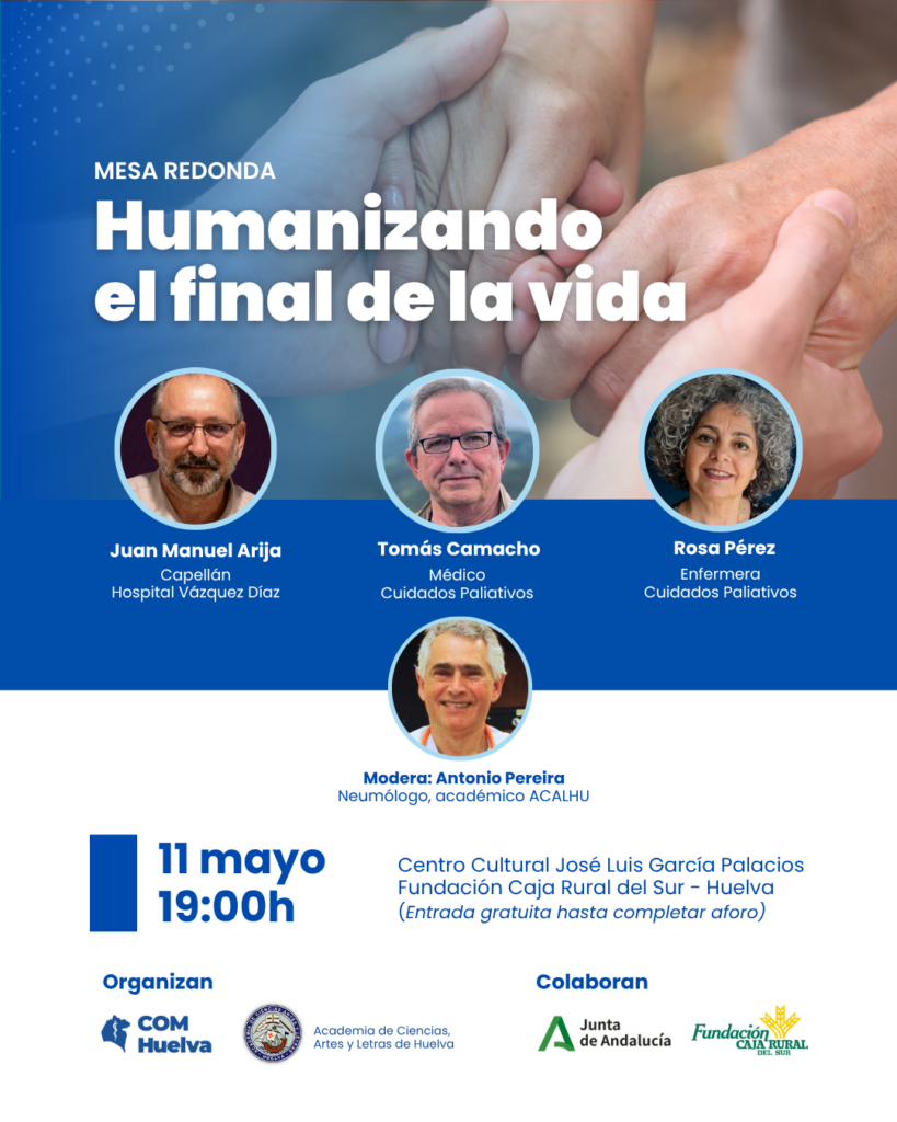 El próximo lunes 11 de mayo, de 19:00 a 21:00 horas, el Salón de Actos José Luis García Palacios de la Fundación Caja Rural en Huelva, acogerá la mesa redonda ‘Humanizando el final de la vida‘, un espacio de reflexión y diálogo centrado en los cuidados paliativos y la atención integral en la etapa final de la vida.